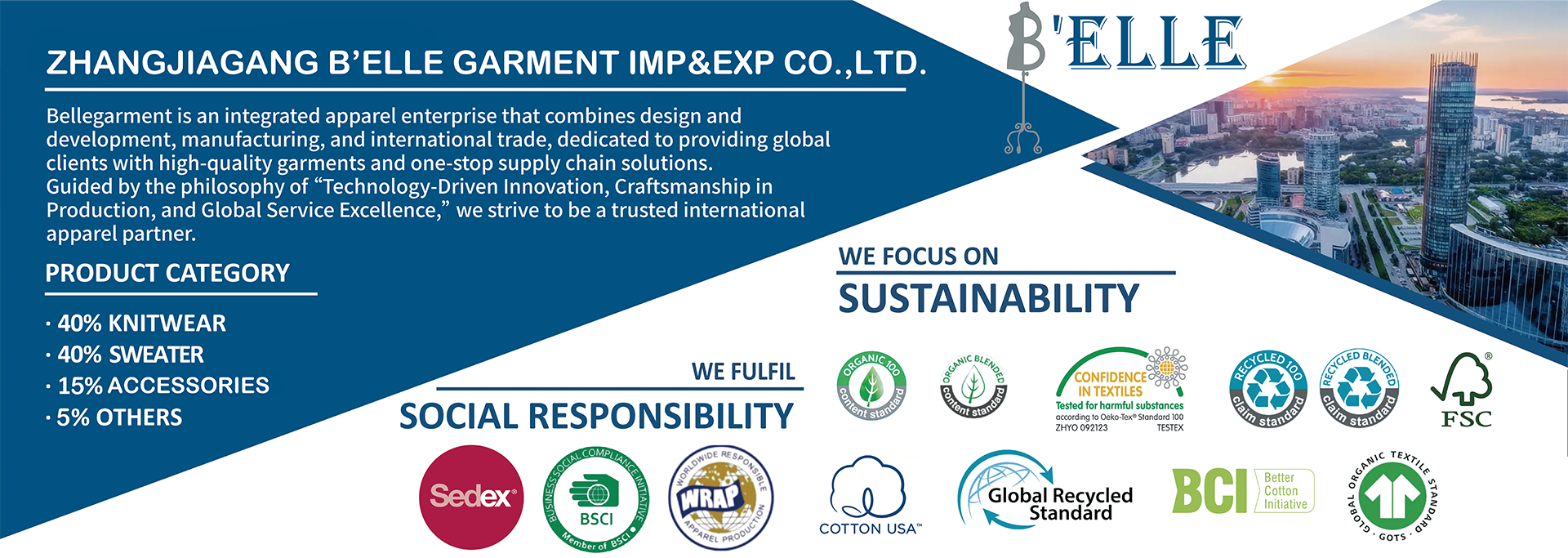 ZHANGJIAGANG B'ELLE GARMENT IMP&EXP CO.,LTD. was established in 2005 as an integrated technology, manufacturing, and trading apparel enterprise. Specia...